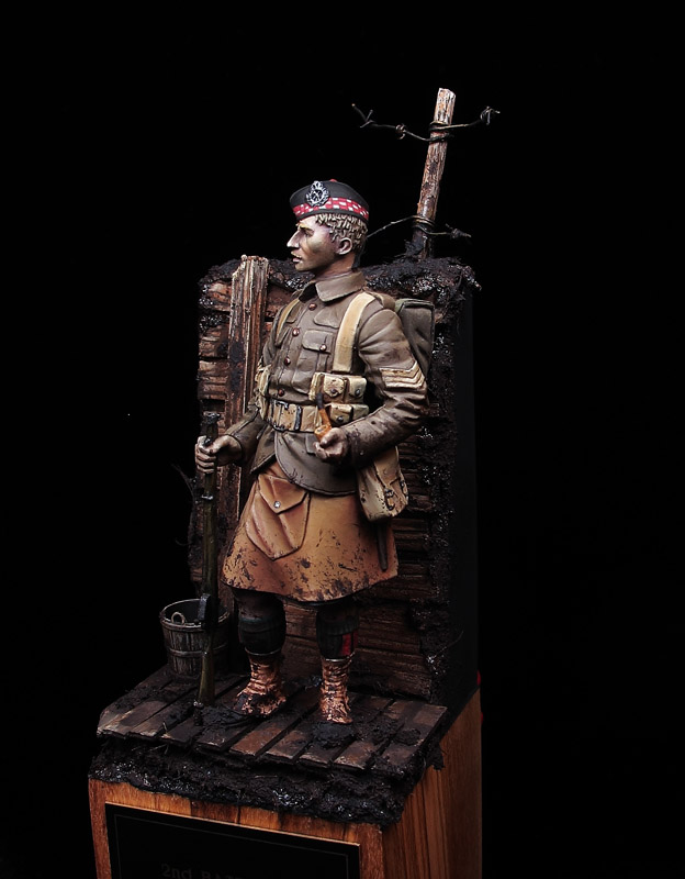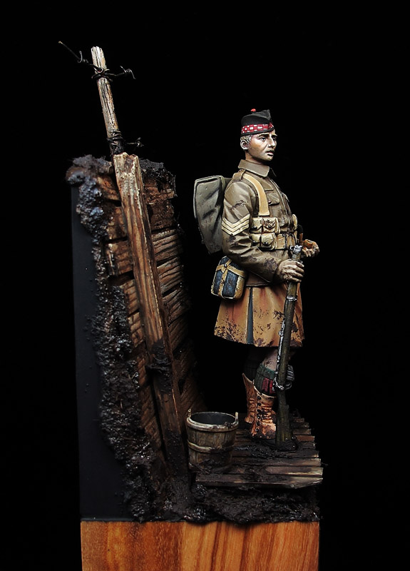 Cuando me decidí a pintar esta figura quise representar en el escenario que iba a acompañarla, algo que fuera lo más descriptivo posible de aquel lapso de la historia y qué mejor representación de la llamada “Guerra de trincheras” que un trozo de trinchera y el barro que tanta dificultad supuso para para el despliegue de las tropas participantes.